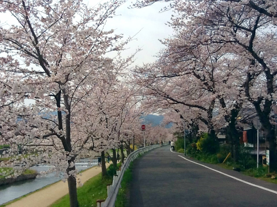 北大路橋〜北山橋までの間、鴨川の東側は半木の道という紅枝垂桜の並ぶお散歩道(車通行不可)でしたが、北山橋以北は車道が登場します。